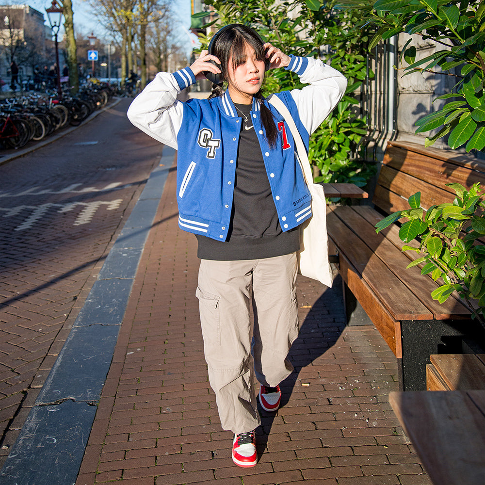 Stand out from the crowd with this royal blue varsity jacket with red, white, and black embroidered accents, inspired by the colours of the flag of South Korea - home of Bangtan.